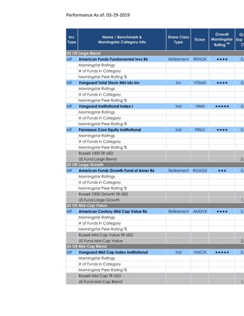 Performance As of: 03‐29‐2019 Name / Benchmark & Inv. Morningstar Category Info Type US OE Large Blend American Funds Fundamental Invs R6 MF Morningstar Ratings # of Funds in Category Morningstar Peer Rating % Vanguard Total Stock Mkt Idx Inv MF Morningstar Ratings # of Funds in Category Morningstar Peer Rating % Vanguard Institutional Index I MF Morningstar Ratings # of Funds in Category Morningstar Peer Rating % Parnassus Core Equity Institutional MF Morningstar Ratings # of Funds in Category Morningstar Peer Rating % Russell 1000 TR USD US Fund Large Blend US OE Large Growth American Funds
