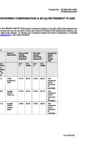 Effective April 30, 2020 the new investment option(s) listed below are being added to the plan and effective April 30, 2020 certain investment options in the plan will be discontinued and