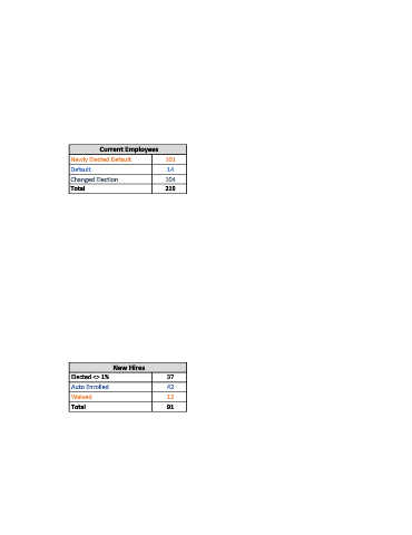 Current Employees Newly Elected Default 101 Default 14 Changed Election 104 Total 219 New Hires Elected <> 1% 37 Auto Enrolled 42 Waived 12 Total 91
