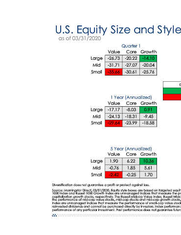 Growth Growth Core Value -14.10 -20.22 -26.73 Large -14.10 -20.04 -27.07 -31.71 Mid -20.04 -25.76 -30.61 -35.66 Small -25.76 Key Highest Lowest 3 Year (Annualized) Growth Core Value Growth 11.32 4.64 -2.18 Large 0.91 6.53 -0.81 -5.97 Mid -9.45 0.10 -4.64 -9.51 Small -18.58 10 Year (Annualized) Growth Core Value Growth 12.97 10.39 7.67 Large 10.36 10.89 8.77 7.22 Mid 5.61 8.89 6.90 4.79 Small 1.70 Source: Morningstar Direct, 03/31/2020. Equity style boxes are based on targeted equity styles as determined by valuation measures. The
