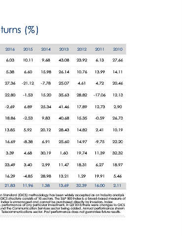 2011 6.13 13.99 4.72 -17.06 12.73 -0.59 2.41 -9.75 11.39 6.27 19.91 16.00 500 Index is a broad-based measure of directly by investors. Index In Q3 2018 there were changes to GICS