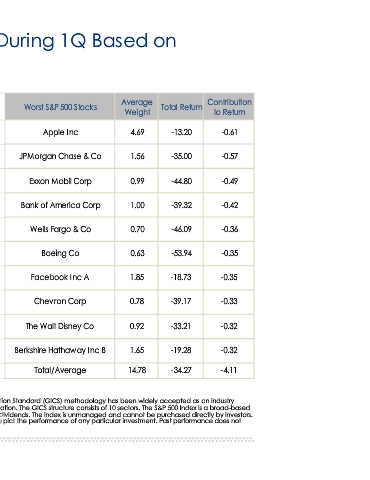 Contribution to Return 0.16 0.09 0.07 0.05 0.03 0.03 0.02 0.02 0.01 0.01 0.48 Source of chart data: Morningstar Direct, 03/31/2020. The Global Industry Classification Standard (GICS) methodology has been widely accepted as an industry analysis framework for investment research, portfolio management and asset allocation. The GICS structure consists of 10 sectors. The S&P 500 Index is a broad-based measure of domestic stock market performance that includes the reinvestment of dividends. The index is unmanaged and cannot be purchased directly by investors. Index perform