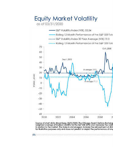 as of 03/31/2020 Source of chart data: Bloomberg, 03/31/2020. The Chicago Board Options Exchange S&P 500 Volatility Index is a measure of stock market volatility. The VIX takes the level weighted average of implied volatility for the S&P 500 (SPX) and measures the volatility of the market. Dividing the S&P 500 by the VIX (ratio) gives the confidence investors. Index performance is shown in relation to the market. The index is unmanaged, includes the reinvestment of dividends and cannot be purchased directl