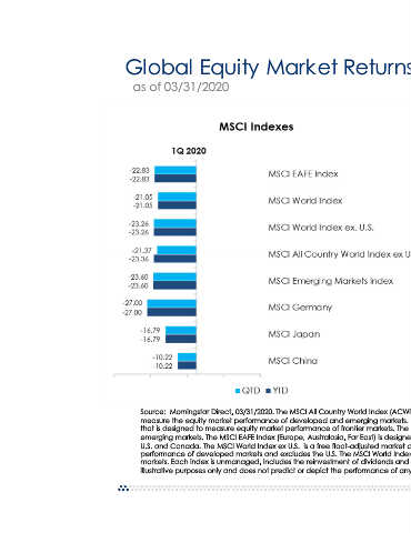 as of 03/31/2020 MSCI Indexes: Total Net Return as of 03/31/2020 * 3-Year, 5-Year, and 10-Year returns are annualized 10-Year* 5-Year* 3-Year* 1-Year 2.72 -0.62 -1.82 -14.38 6.57 3.25 1.92 -10.39 2.43 -0.76 -2.07 -14.89 2.05 -0.64 -1.96 -15.57 0.68 -0.37 -1.62 -17.69 2.19 -3.99 -6.84 -17.54 3.83 1.82 0.95 -6.69 4.38 3.57 7.05 -5.82 Source: Morningstar Direct, 03/31/2020. The MSCI All Country World Index (ACWI) is a free-float-adjusted, market-capitalization-weighted index that is designed to measure the equity market performance of developed and emerging marke