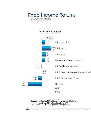 as of 03/31/2020 MSCI Indexes: Total Net Return as of 03/31/2020 * 3 Year, 5 Year, and 10 year returns are annualized YTM Duration 10-Year* 5-Year* 3-Year* 1-Year 1.59 5.69 3.88 3.36 4.82 8.93 0.58 7.02 3.83 3.64 5.82 13.23 1.91 5.62 2.81 2.92 4.22 8.31 1.34 1.67 3.28 2.94 4.04 7.03 2.40 2.07 2.47 1.99 2.35 2.79 2.56 5.21 4.89 3.13 4.06 5.37 3.43 7.98 4.92 3.36 4.20 4.98 9.44 4.06 5.64 2.78 0.77 -6.94 Morningstar, 03/31/2020. Chart and Annual Returns Source: Bloomberg, 03/31/2020. Duration and YTM Past performance does not guarantee future