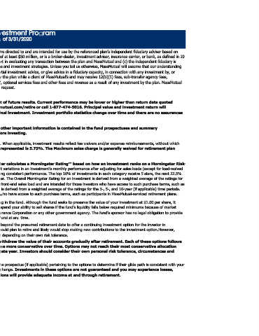 Performance as of 3/31/2020 The MassMutual Investment Program Notwithstanding some of the terms used in these materials (e.g., plan sponsor or employer), these materials are directed to and are intended for use by the referenced plan’s independent fiduciary adviser based on MassMutual’s understanding that (a) the independent fiduciary has under management or control total assets of at least $50 million, or is a broker-dealer, investment adviser, insurance carrier, or bank, as defined in 29 CFR section 2510.3-21(c)(1) ), (b) the independent fiduciary is responsible for exercising independent judgment in