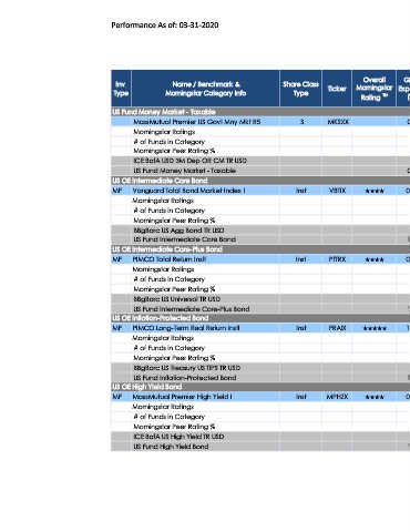 Performance As of: 03‐31‐2020 Name / Benchmark & Inv. Morningstar Category Info Type US Fund Money Market - Taxable MassMutual Premier US Govt Mny Mkt R5 Morningstar Ratings # of Funds in Category Morningstar Peer Rating % ICE BofA USD 3M Dep OR CM TR USD US Fund Money Market - Taxable US OE Intermediate Core Bond Vanguard Total Bond Market Index I MF Morningstar Ratings # of Funds in Category Morningstar Peer Rating % BBgBarc US Agg Bond TR USD US Fund Intermediate Core Bond US OE Intermediate Core-Plus Bond PIMCO Total Return Instl MF Morningstar Ratings # of Funds in Category Morningstar Peer Rati
