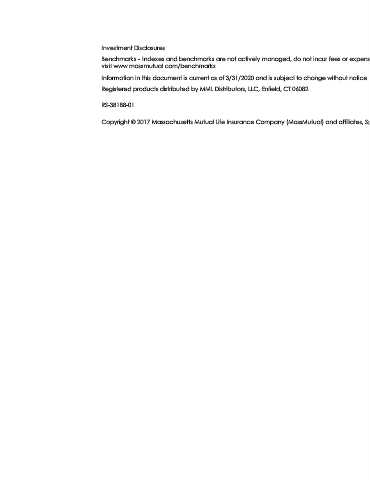 Investment Disclosures Benchmarks - Indexes and benchmarks are not actively managed, do not incur fees or expenses, and are not available for direct investment. For a full list of benchmark definitions, please visit www.massmutual.com/benchmarks. Information in this document is current as of 3/31/2020 and is subject to change without notice. Registered products distributed by MML Distributors, LLC, Enfield, CT 06082 RS-38188-01 Copyright © 2017 Massachusetts Mutual Life Insurance Company (MassMutual) and affiliates, Springfield, MA 01111-0001. All rights reserved.