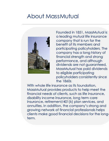 the 1860s. policyholders consistently since With whole life insurance as its foundation, MassMutual provides products to help meet the financial needs of clients, such as life insurance, disability income insurance, long term care insurance, retirement/401(k) plan services, and annuities. In addition, the company’s strong and growing network of financial professionals helps clients make good financial decisions for the long-