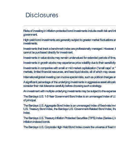 Disclosures Risks of investing in inflation-protected bond investments include credit risk and interest rate risk. Neither the bond investment nor its yield is guaranteed by the U.S. government. High-yield bond investments are generally subject to greater market fluctuations and risk of loss of income and principal than lower-yielding debt securities investments. Investments that track a benchmark index are professionally managed. However, the benchmark index itself is unmanaged and does not incur fees or expenses and cannot be purchased directly for investment. Investments in value stocks may rem