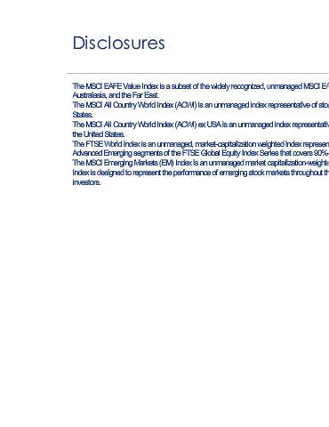 Disclosures The MSCI EAFE Value Index is a subset of the widely recognized, unmanaged MSCI EAFE Index and constituents of the Index include securities from Europe, Australasia, and the Far East. The MSCI All Country World Index (ACWI) is an unmanaged index representative of stocks domiciled in global developed and emerging markets, including the United States. The MSCI All Country World Index (ACWI) ex USA is an unmanaged index representative of stocks domiciled in global developed and emerging markets, excluding the United States. stocks from the Developed and The FTSE World Index is an unmanaged