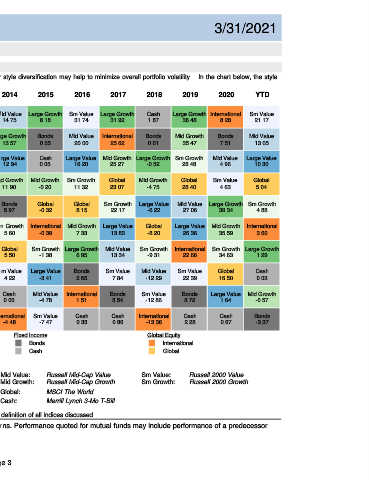 The chart below illustrates how often different styles rotate in market leadership over time and why style diversification may help to minimize overall portfolio volatility. In the chart below, the style
