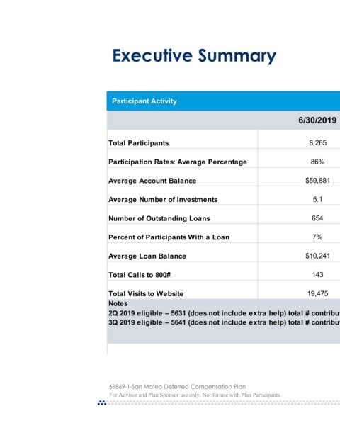 Participant Activity Total Participants Participation Rates: Average Percentage Average Account Balance Average Number of Investments Number of Outstanding Loans Percent of Participants With a Loan Average Loan Balance Total Calls to 800# Total Visits to Website Notes 61869-1-San Mateo Deferred Compensation Plan For Advisor and Plan Sponsor use only. Not for use with Plan Participants.