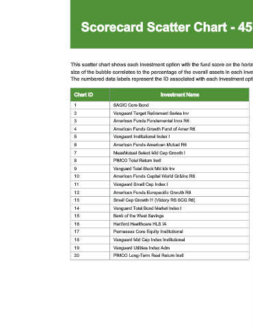This scatter chart shows each investment option with the fund score on the horizontal axis and the dollar amount invested in each option on the vertical axis. The