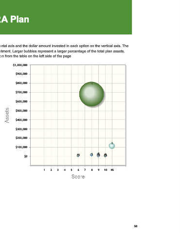 This scatter chart shows each investment option with the fund score on the horizontal axis and the dollar amount invested in each option on the vertical axis. The