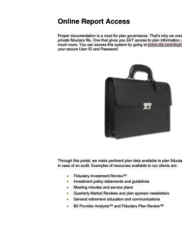 much more. You can access this system by going to www.nfp.com/login, selecting Fiduciary Briefcase from the drop-down menu and then enter