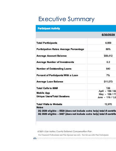 Participant Activity Total Participants Participation Rates: Average Percentage Average Account Balance Average Number of Investments Number of Outstanding Loans Percent of Participants With a Loan Average Loan Balance Total Calls to 800# Mobile App Unique Users/Total Sessions Total Visits to Website Notes 61869-1-San Mateo County Deferred Compensation Plan For Financial Professional and Plan Sponsor use only. For Advisor and Plan Sponsor use only. Not for use with Plan Participants.