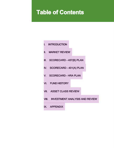 Table of Contents I. INTRODUCTION II. MARKET REVIEW III. SCORECARD - 457(B) PLAN IV. SCORECARD - 401(A) PLAN V. SCORECARD - HRA PLAN VI. FUND HISTORY VII. ASSET CLASS REVIEW VIII. INVESTMENT ANALYSIS AND REVIEW IX. APPENDIX
