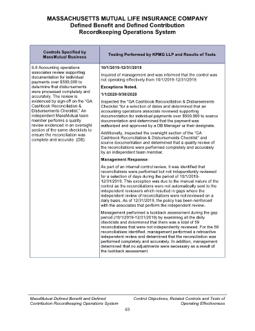 MassMutual Business Testing Performed by KPMG LLP and Results of Tests