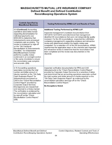 MassMutual Business Testing Performed by KPMG LLP and Results of Tests