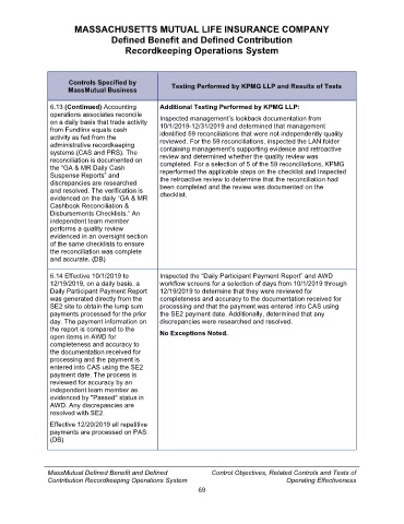 MassMutual Business Testing Performed by KPMG LLP and Results of Tests