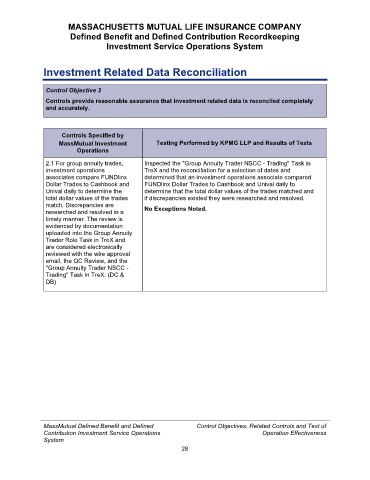 MassMutual Defined Benefit and Defined Control Objectives, Related Controls and Test of