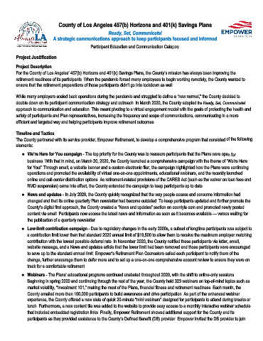 retirement readiness of its participants. When the pandemic forced many employees to begin working remotely, the County wanted to
