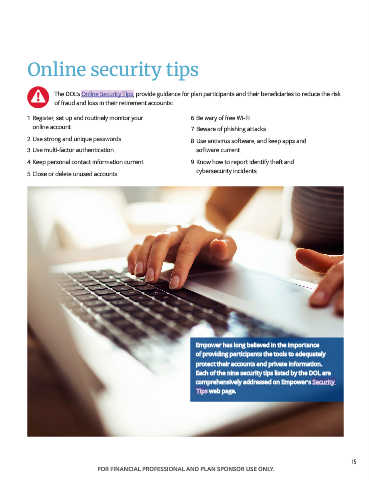 The DOL’s Online Security Tips, provide guidance for plan participants and their beneficiaries to reduce the risk