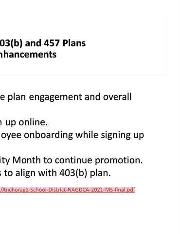 • Enacted 457 plan enhancements to align with 403(b) plan.